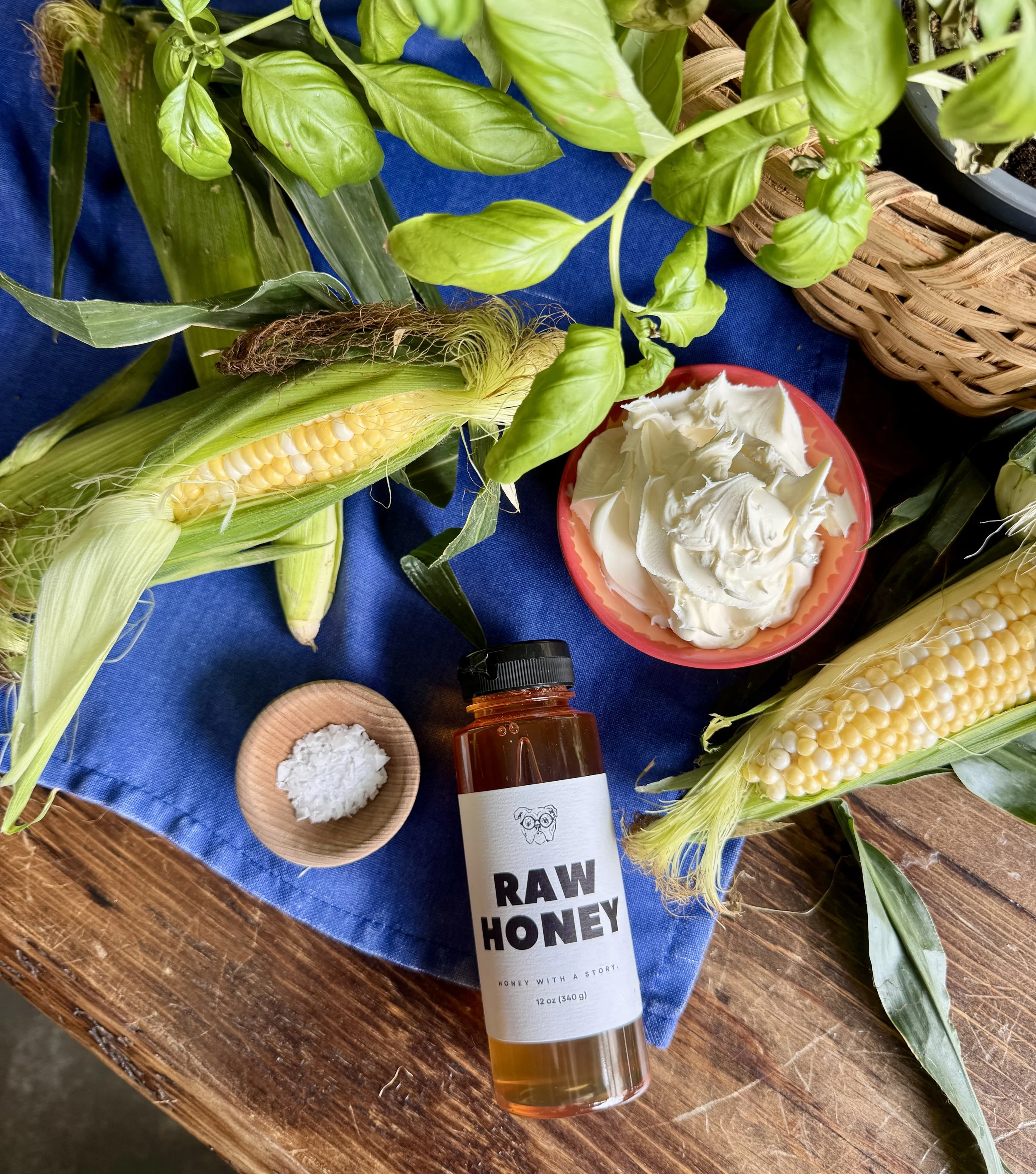 Local Corn, too much basil, raw honey drizzles, and one perfectly messy Beekeeper’s Kitchen…